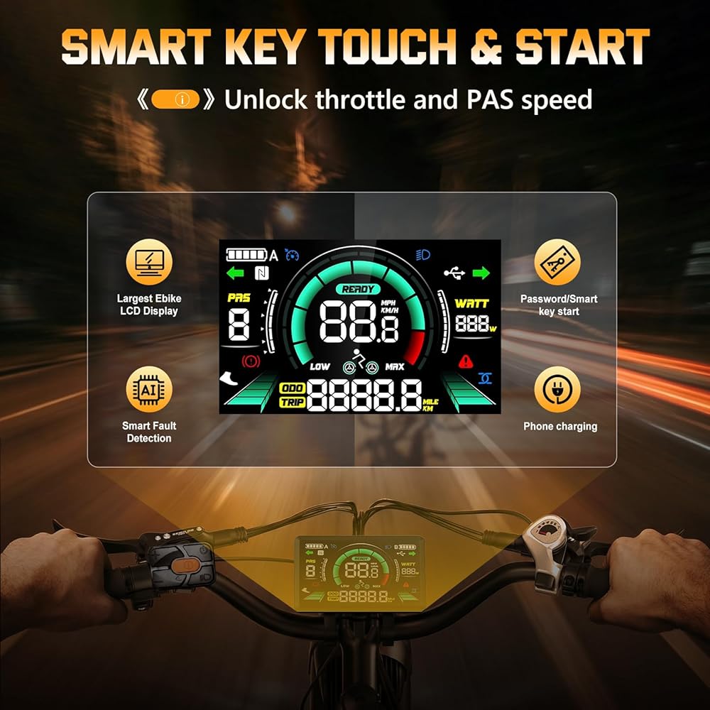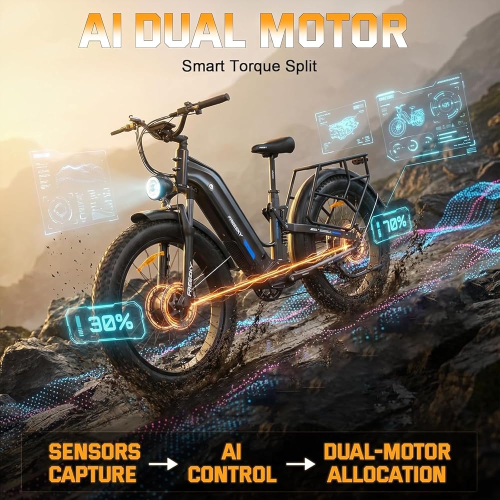 ใ200NM ๐๐ Dual Motor โ Smarter Riding, Less Effortใ This premium electric bike features a smarter dual motor system with ๐๐-driven power distribution. It intelligently adapts to your ride, providing optimal torque to conquer 40ยฐ slopes and rough dirt with confidence. The ๐๐ reduces effort by 20% and allows seamless switching between drive modes, making it a revolutionary dual motor electric bike for effortless, all-terrain control. | ใ250 W Power Road Mode & Private-Track Modeใ UK-legal 250 W -25 km/h(15miles) on public roads. Private-Track Mode unlocked via display โ โTorque++โ gives 2ร pull & โFastPassโ Press i Button for those extra-private hectares; 105miles๏ผ170 km๏ผ Long Range 25A 48V Battery, 26" Fat Tyre Full-Suspension electric mountain bike for Adult men & women | ใ105-Mile Long Range & Removable Fast-Charge Battery ใ Engineered for extended adventures, this long-range electric bike delivers up to 105 miles on a single charge with its 48V 25Ah removable battery. It supports 3A fast charging and features advanced BMS protection for safety. The convenient, detachable design makes this reliable ebike perfect for daily commutes and long-distance exploration. | ใFull Suspension, Fat Tires & Step-Through Frame ใ Experience superior comfort on any terrain. This electric mountain bike combines adjustable hydraulic Full Suspension, 26" Fat Tires, and an easy-mount step-through frame. It absorbs over 90% of vibrations on pavement and dirt, offering a stable, smooth ride for adults of all sizes (5'4" to 6'8"). | ใ7 Versatile Riding Modes for Total Control ใ Tailor your ride with 7 distinct modes on this intelligent electric bicycle. Choose from dual or single motor drive, pedal assist, throttle-only, cruise control, walk-assist, and manual pedaling. This flexibility makes the dual motor ebike adaptable for any scenario, from steep climbs to casual city cruising. | ใSmart LCD Display with ๐ก๐๐ Keyless Unlock ใ Stay informed and secure with the advanced smart LCD. It clearly displays your speed, battery level, and distance. The keyless ๐ก๐๐ unlocking system lets you access your ebike with a tap of a card or your smartphone, offering both convenience and enhanced security for adult riders.