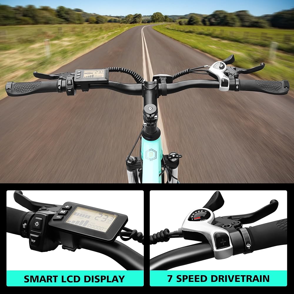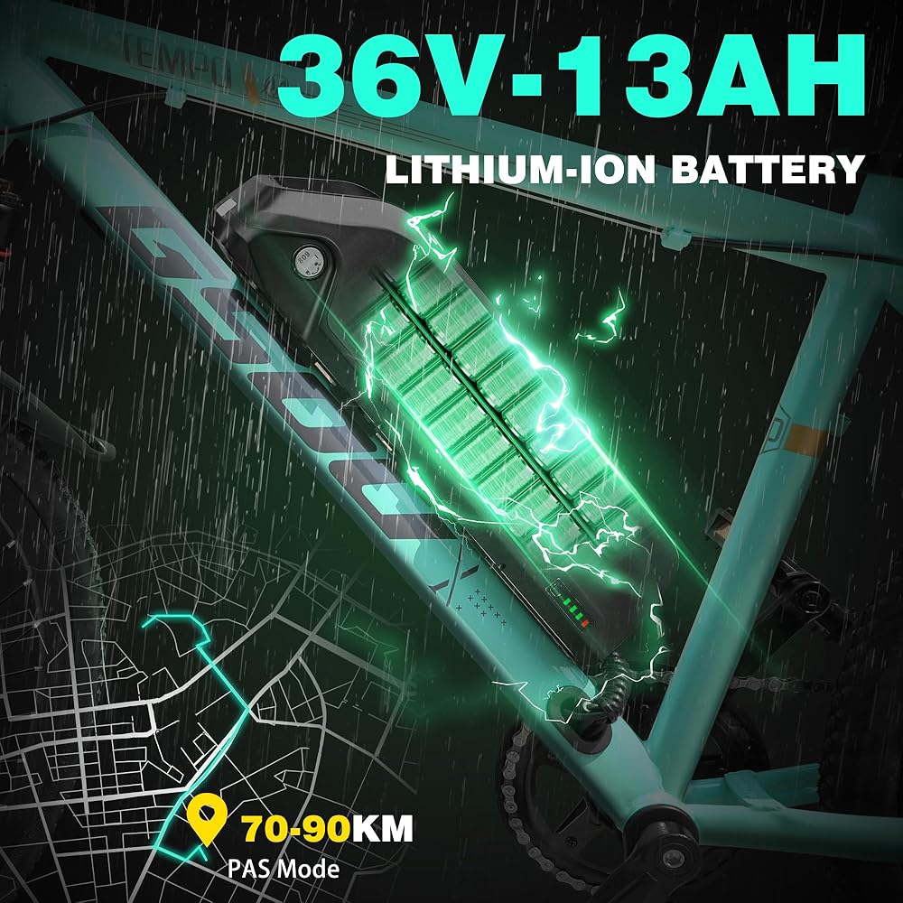 ⚡ 【Extended-Range Electric Bike】- Powered by a 36V 13Ah removable lithium-ion battery (delivers 70-90km PAS range). Fast-charges in 4hrs for daily commutes. | ⛰️ 【True Electric Mountain Bike】- 250W brushless motor (50Nm torque) + 7-speed drivetrain conquers 25° UK slopes. Lockable suspension & 26"x1.95" puncture-resistant tyres handle rugged trails. | 🌧️ 【All-Season Electric Commuter Bike】- IPX4 waterproof cables connectors + dual disc brakes ensure safety in UK rain. Smart LCD display tracks speed/distance/battery. | 🛣️ 【EAPC-Compliant Electric City Bike】- 2 compliant modes (UK-Legal): PAS (5-levels: 12-25km/h/7.5-15.5mph) | Fitness (Zero-assist cycling | switch off motor assistance for a pure cycling workout). | 🔒 【Lockable Suspension Fork】- 100mm travel spring suspension fork features one-click lockout (saves battery + boosts speed on smooth roads). Instantly switches to cushion mode on rough trails (optimizes impact absorption). Sealed structure + steel spring resists mud/sand corrosion | extending off-road lifespan. | 🌫️ 【26x1.95" Pneumatic All-Terrain Tires】- 1.95" wide knobby tread + deep groove design doubles grip on wet roads/gravel (tackles UK’s variable terrain). High-resilience rubber layer absorbs shocks | drastically reducing bumps. | 🔧 【20-Min Hassle-Free Assembly Electric Road Bike】- 85% pre-built eBike. Install front wheel/handlebar/battery... (1-yr Warranty).