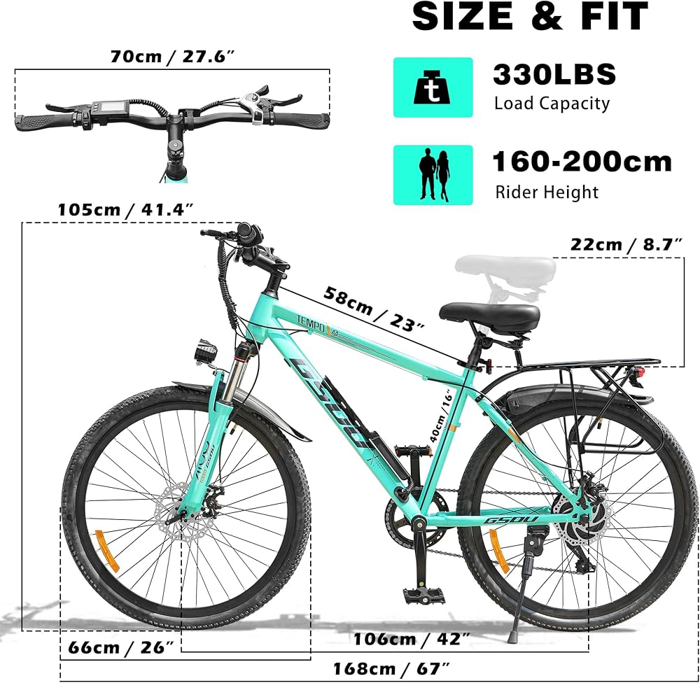 GSOU Electric Bike for Adults | 26'' E-Bike UK Legal 250W | E-Mountain Bike 40-60 Miles Range - 8Ah/13Ah Removable Battery | 7 Speed | Smart LCD | Dual Disc Brakes | Lockable Suspension | City Commute E-Bike